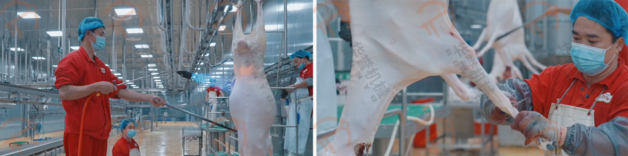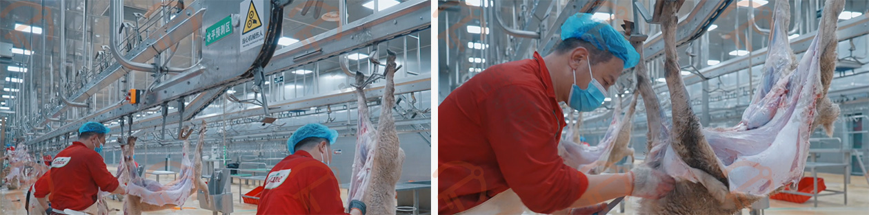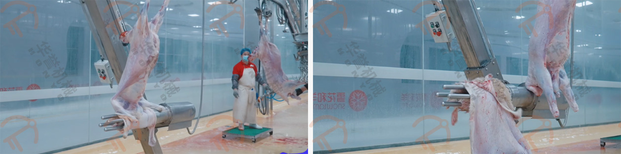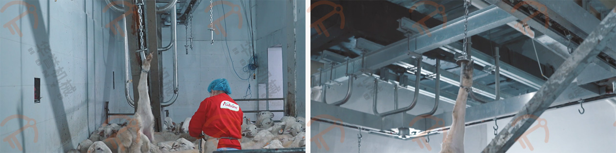 放血/預(yù)剝自動輸送線的掛鉤鉤住羊的后腿,扯皮自動輸送線的掛鉤鉤住羊的兩前腿,這兩條自動線的速度是同步前進的,羊的腹部朝上、背部朝下,平衡前進,在輸送的過程中進行預(yù)剝皮,這種預(yù)剝的方式可有效的控制在預(yù)剝過程中羊毛粘在胴體上。